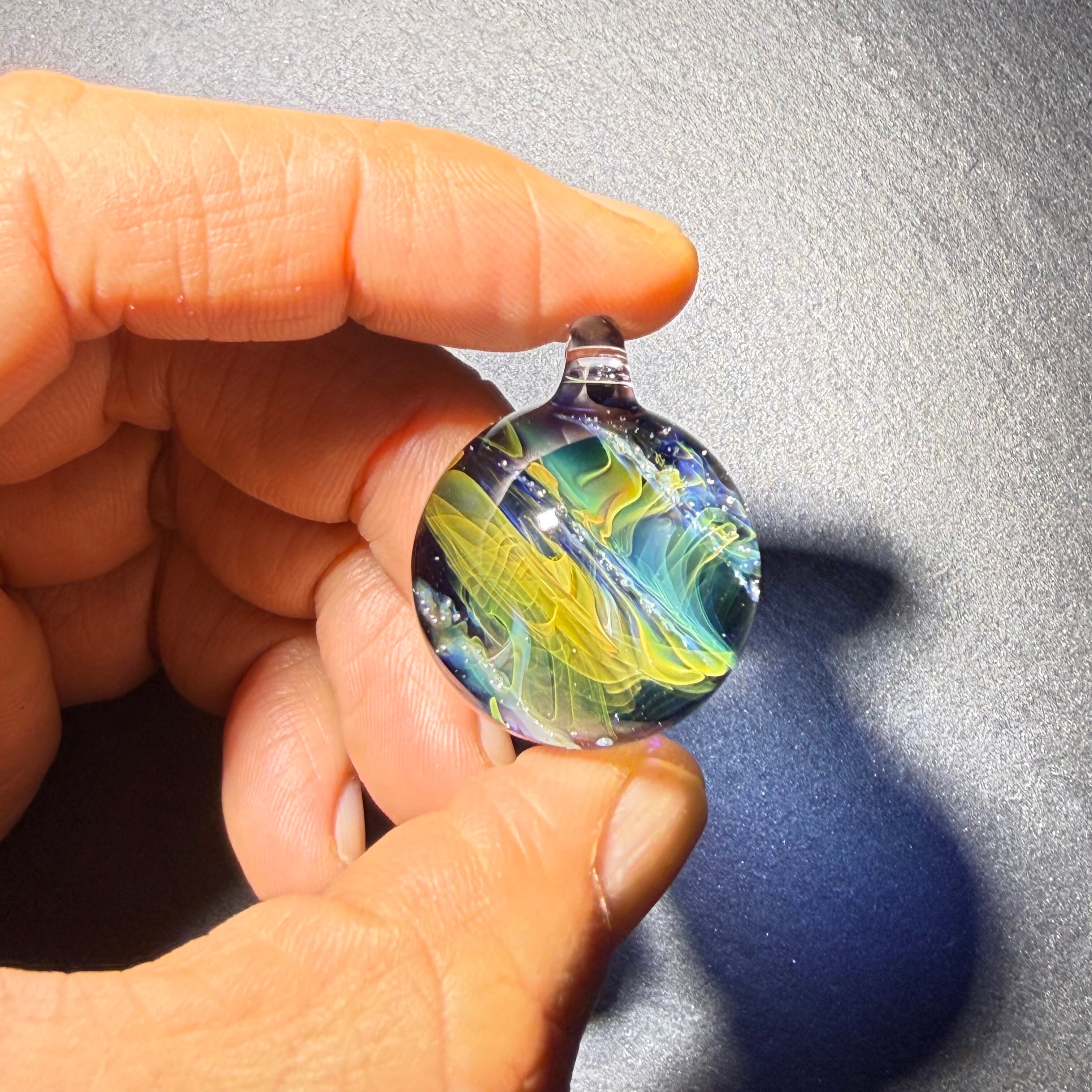 ・透明感と繊細な模様が魅力のペンダントトップです。耐熱ガラス(ボロシリケイト)を使用し、手作業で一つひとつ丁寧に制作しています。
