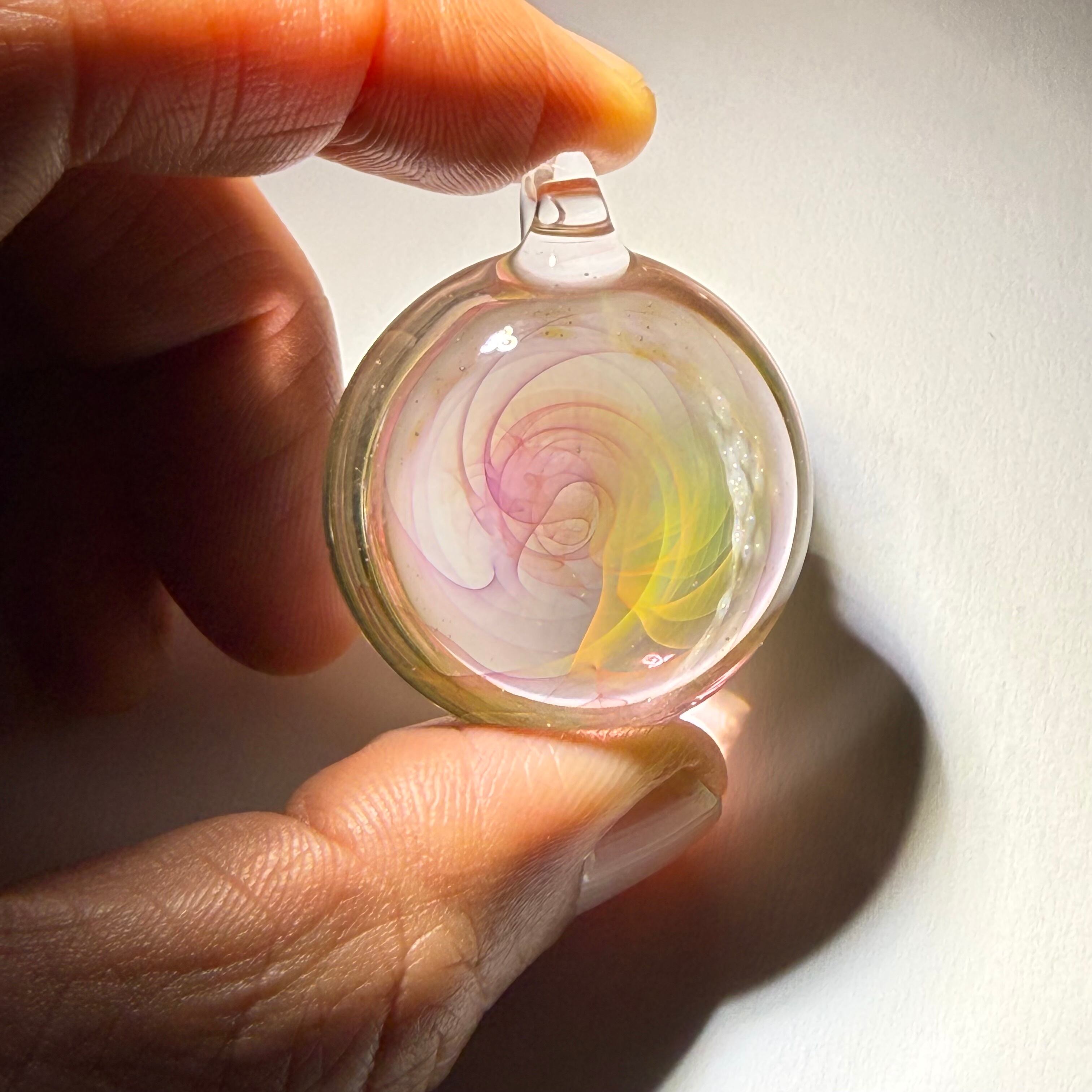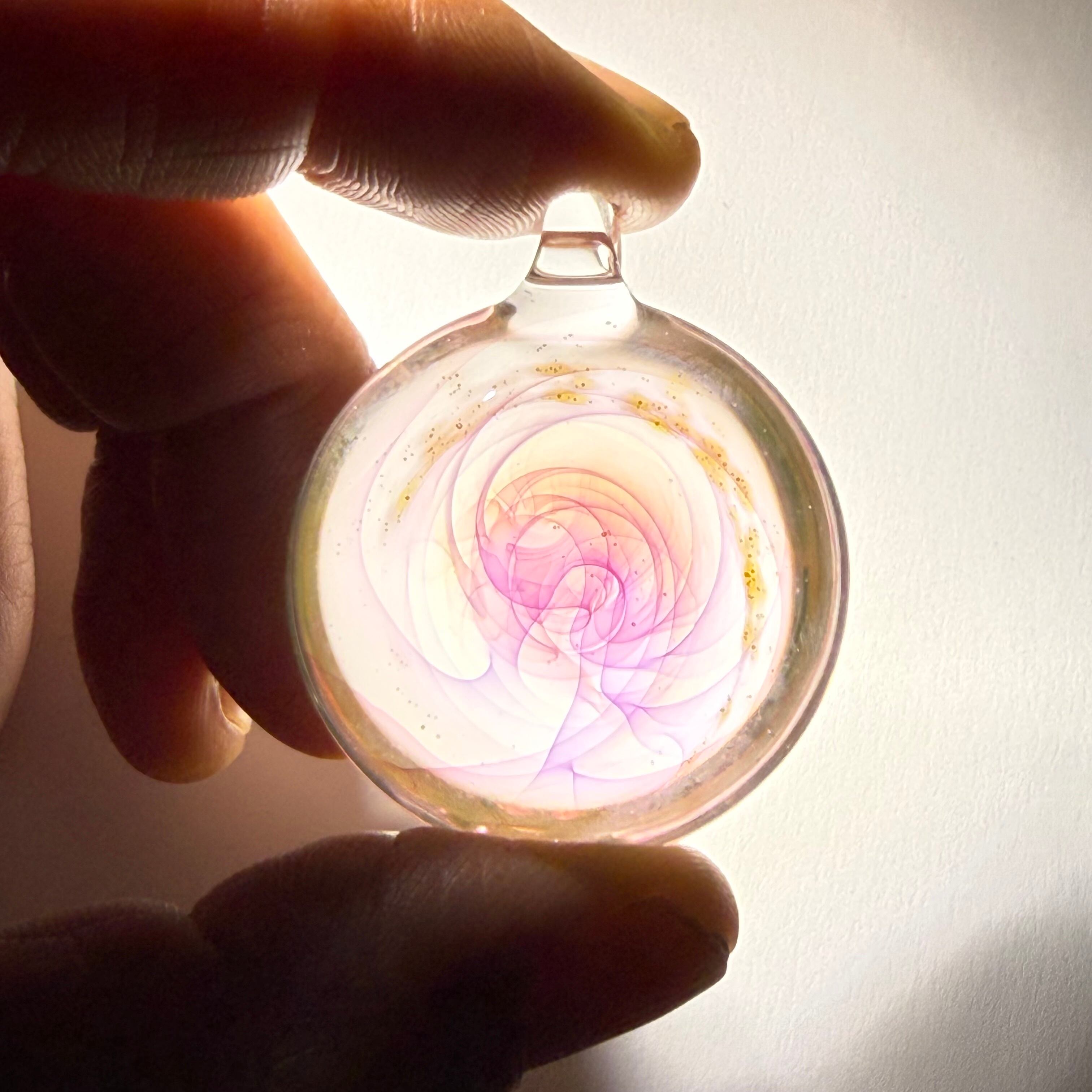 ・透明感と繊細な模様が魅力のペンダントトップです。耐熱ガラス(パイレックス)を使用し、手作業で一つひとつ丁寧に制作しています。