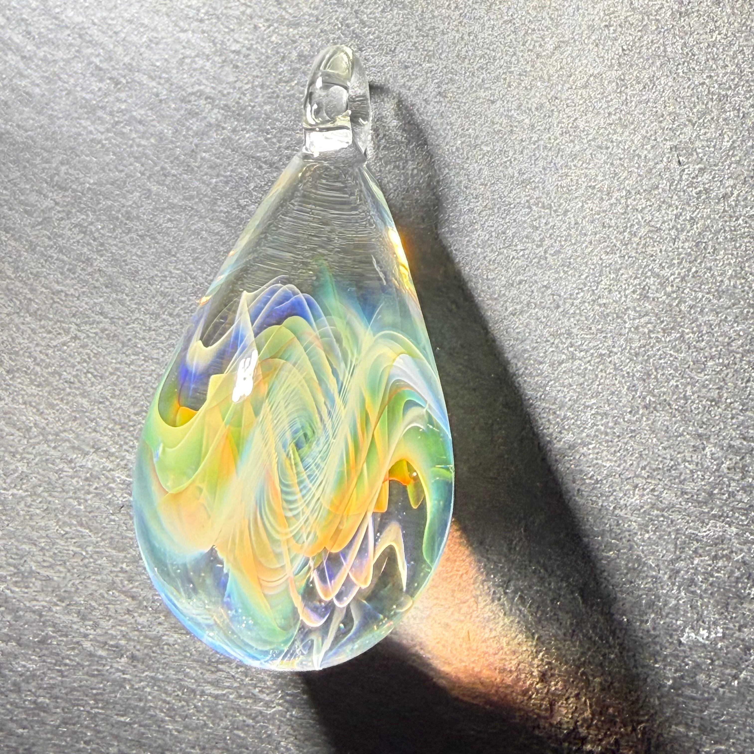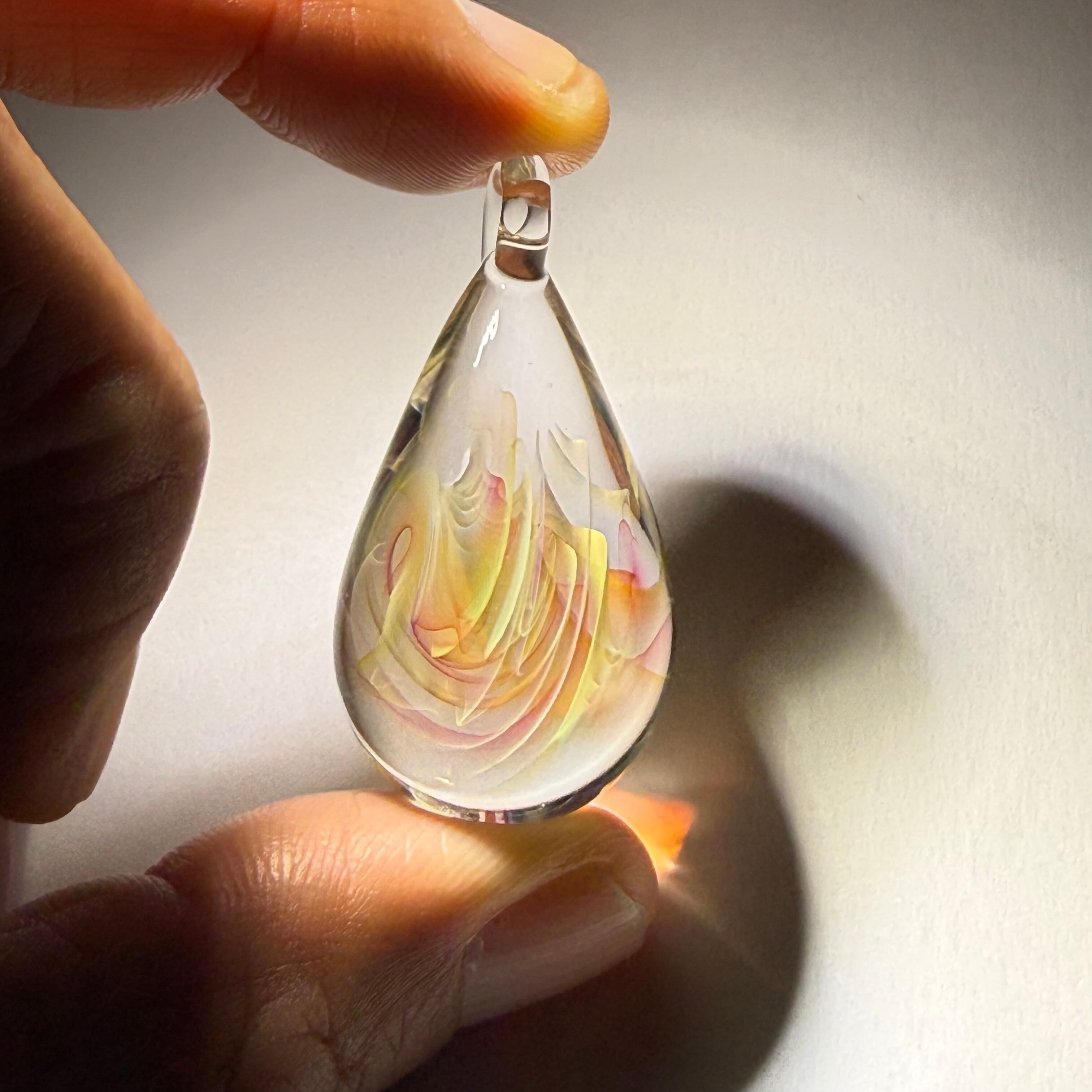 ・透明感と繊細な模様が魅力のペンダントトップです。耐熱ガラス(パイレックス)を使用し、手作業で一つひとつ丁寧に制作しています。