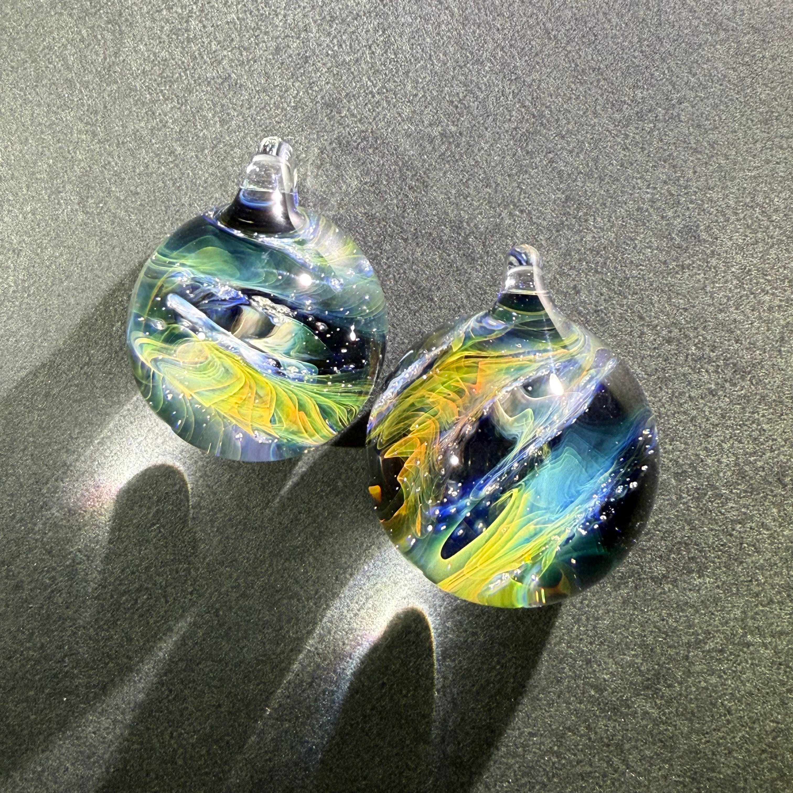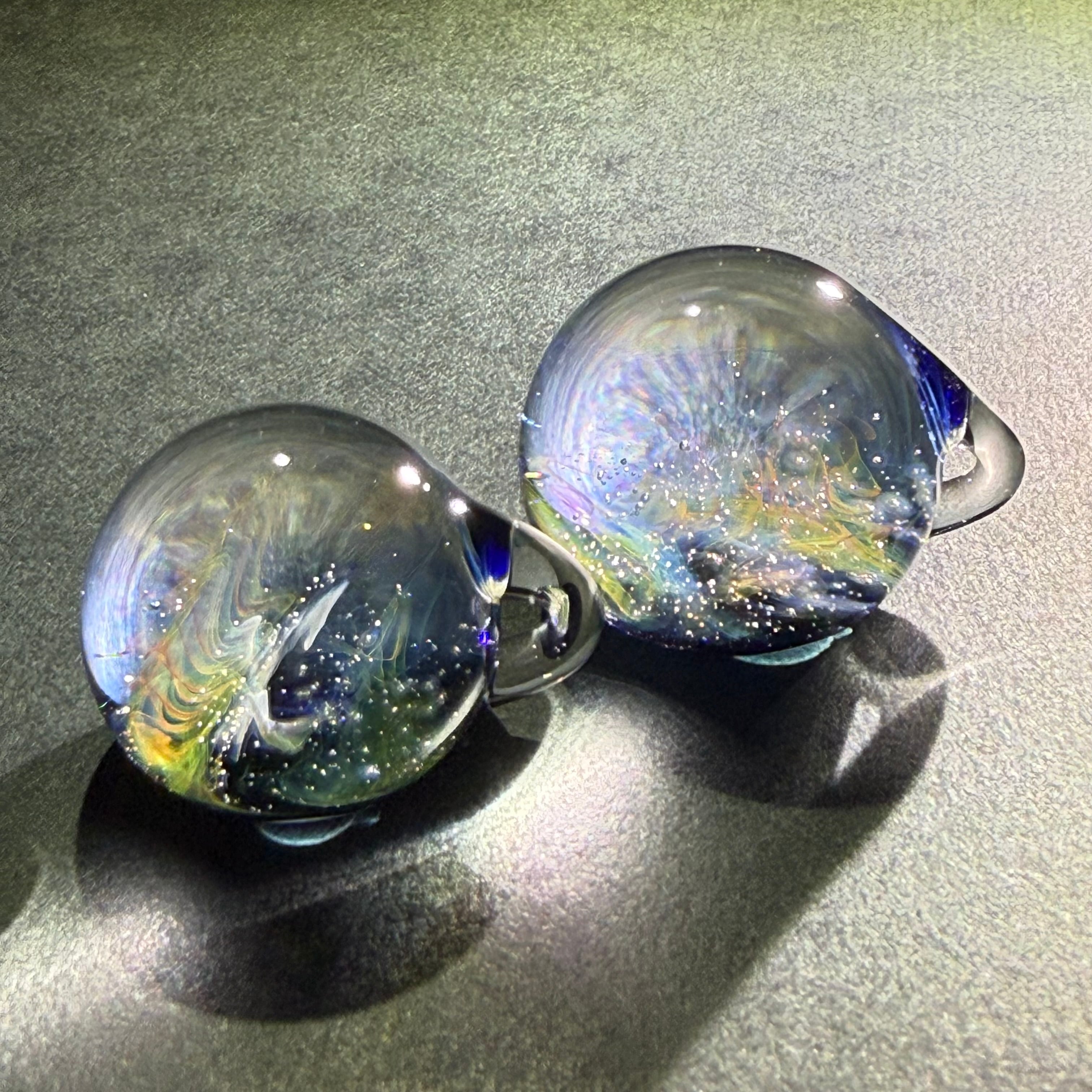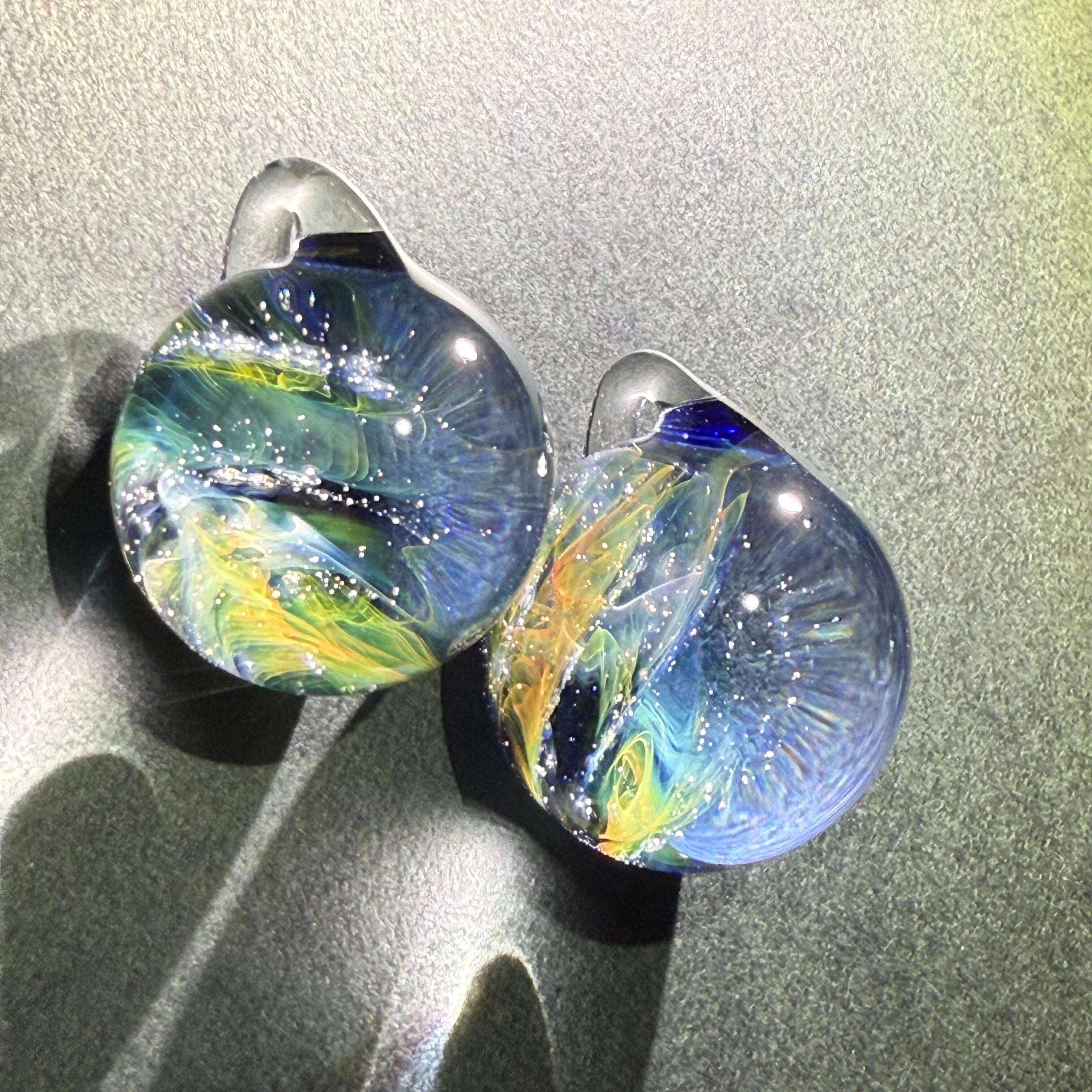 数年前から陰陽統合のビッグバンをイメージし、夫婦で混ぜ合わせた結晶を作ってきました。より小さく、壮大な世界を追い求め・・・目に見えない研究と実践の末、森羅万象・宇宙の意味を含んだcosmicと小さなガラス玉に無限に広がる神秘的な世界をイメージし、「micro cosmic」と名付けました。2022年秋、ひょんな事から分裂が始まり - twin - シリーズが生まれました。仕上がる直前に分かれています。分身のようなペアガラスです。自然な調和を発信したかったのかもしれない。自分という枠を超えた他者とのつながりに、何かただならぬ可能性を感じて制作しています。ただのガラスが、そうでなくなる瞬間をイメージし、魂が共鳴し発動するきっかけになれたらと思います。