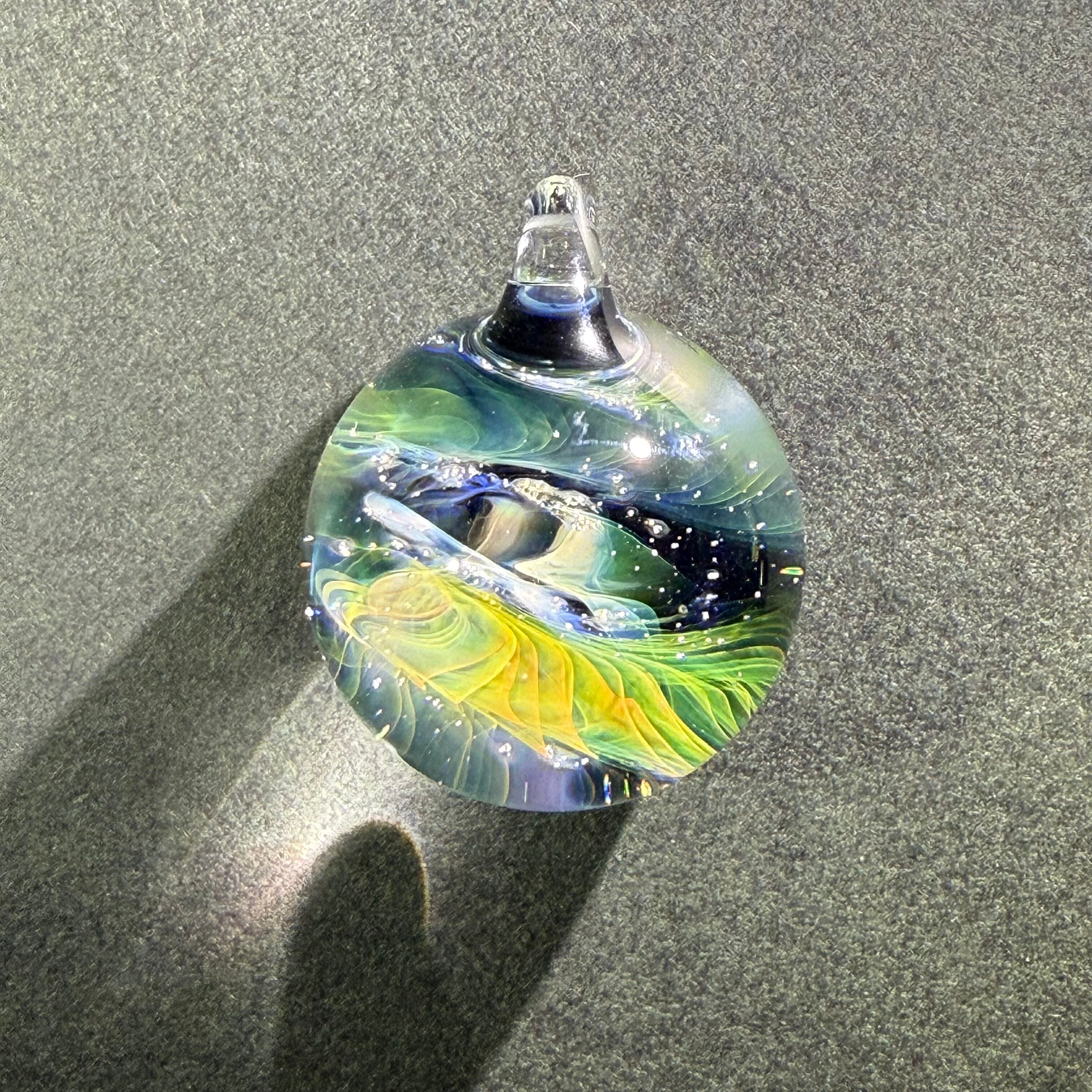 ・透明感と繊細な模様が魅力のペンダントトップです。耐熱ガラス(パイレックス)を使用し、手作業で一つひとつ丁寧に制作しています。