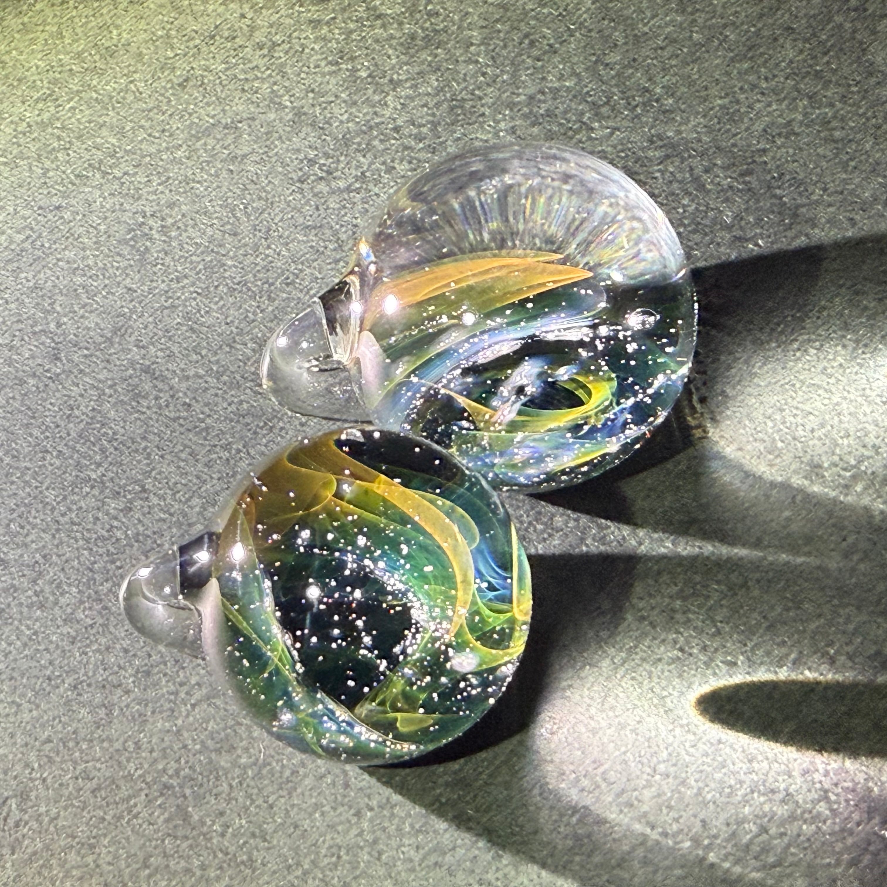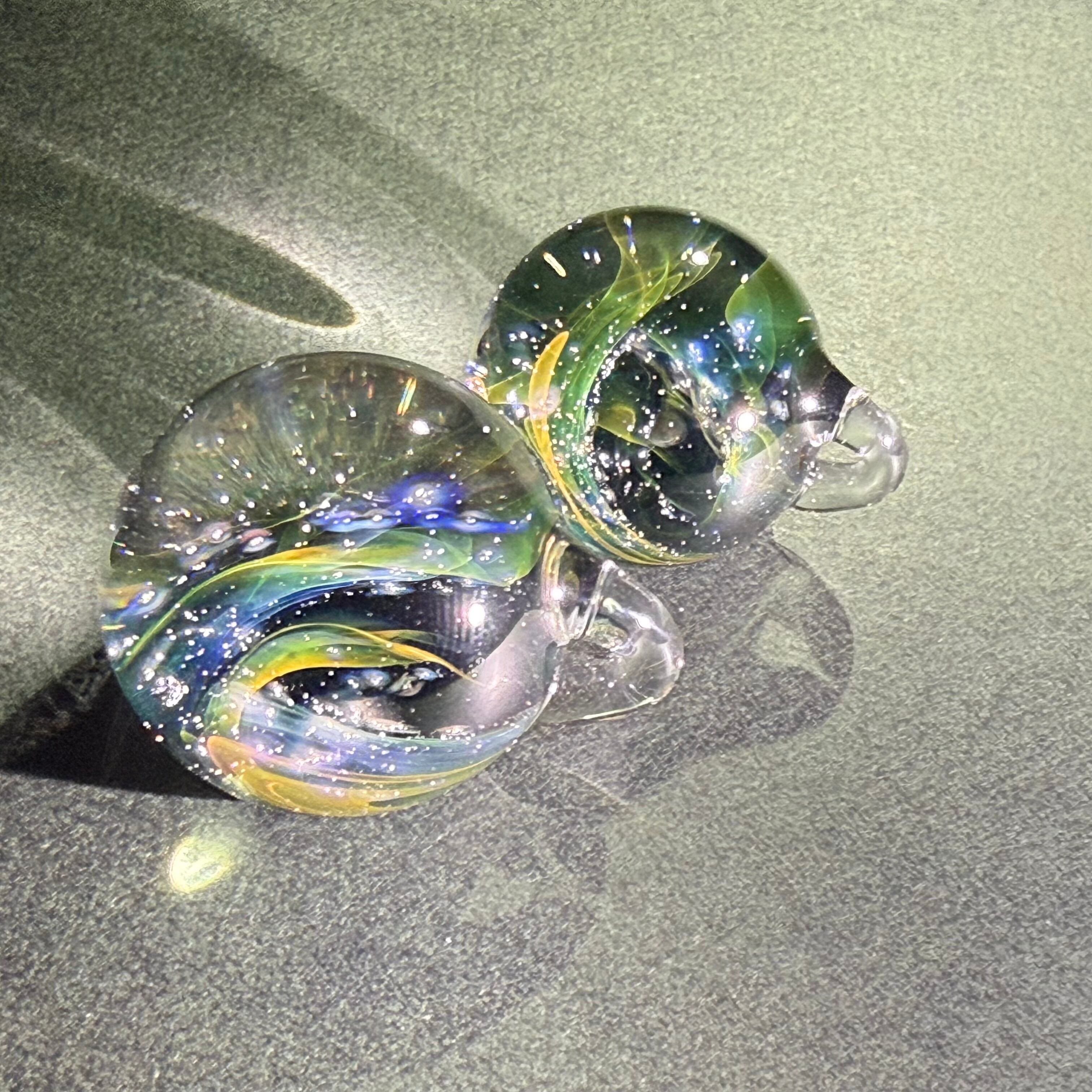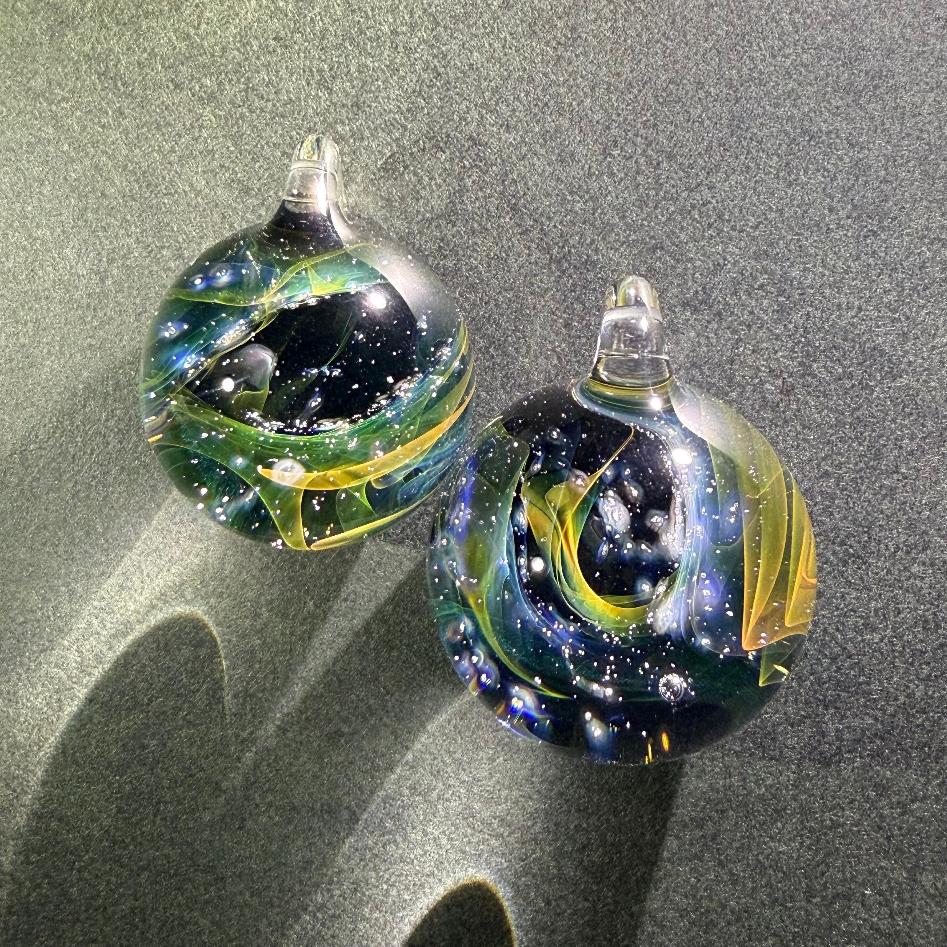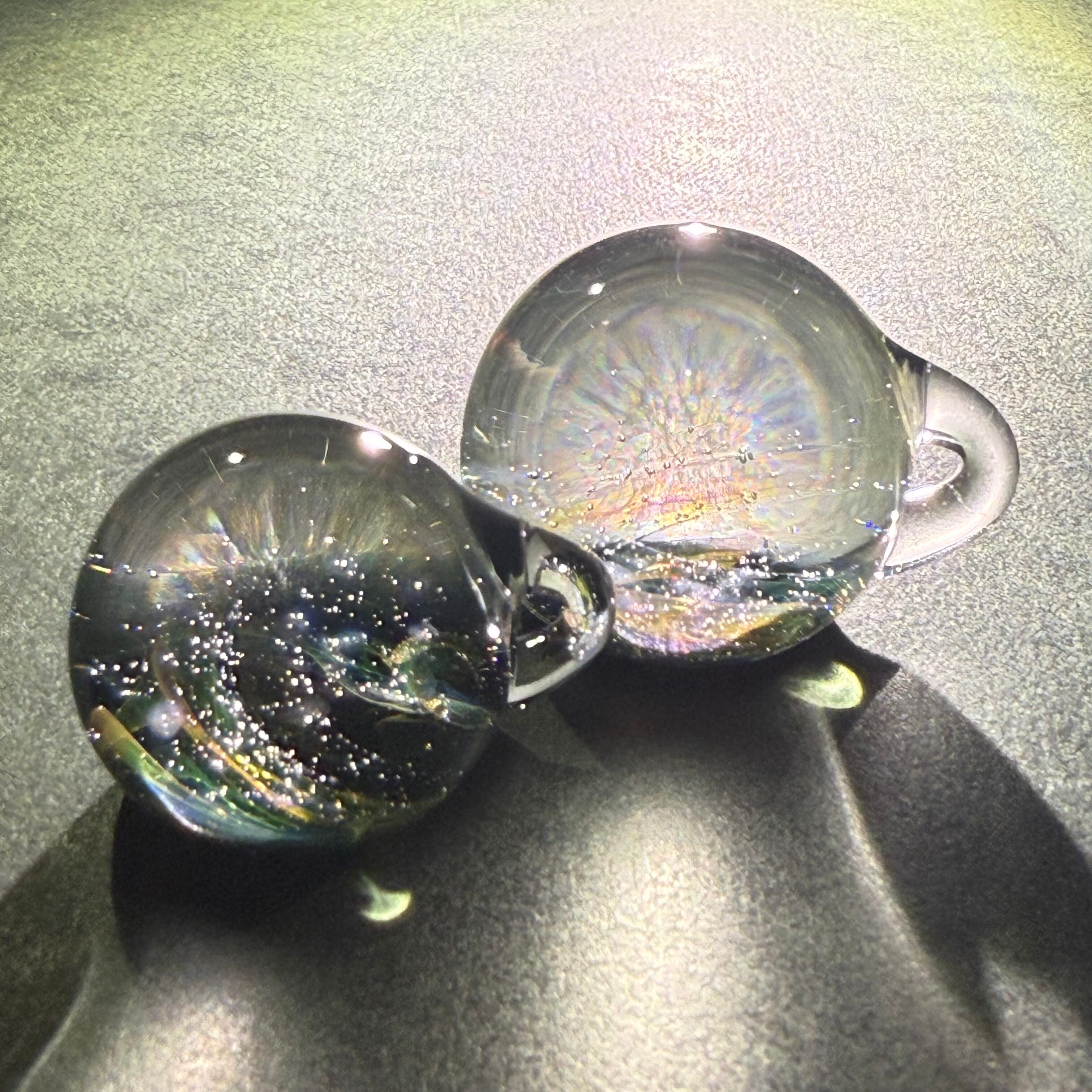 数年前から陰陽統合のビッグバンをイメージし、夫婦で混ぜ合わせた結晶を作ってきました。より小さく、壮大な世界を追い求め・・・目に見えない研究と実践の末、森羅万象・宇宙の意味を含んだcosmicと小さなガラス玉に無限に広がる神秘的な世界をイメージし、「micro cosmic」と名付けました。2022年秋、ひょんな事から分裂が始まり - twin - シリーズが生まれました。仕上がる直前に分かれています。分身のようなペアガラスです。自然な調和を発信したかったのかもしれない。自分という枠を超えた他者とのつながりに、何かただならぬ可能性を感じて制作しています。ただのガラスが、そうでなくなる瞬間をイメージし、魂が共鳴し発動するきっかけになれたらと思います。